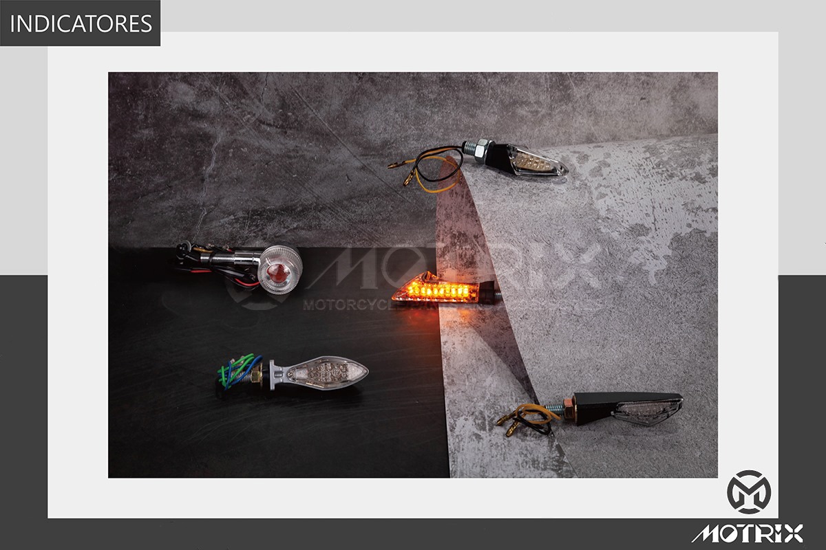 MOTRIX certain to provide a great alternative to motorcycle indicators. Brighter, smaller, better looking! From classic bull's eyes for vintage bikes to high-tech LED indicators, MOTRIX has them all! Come to ask our large selection of hundreds of styles to find the right model to upgrade your old or bulky indicators (turn signals), and add new visibility and style to your motorcycle with our strict quality selection of indicators (turn signals)